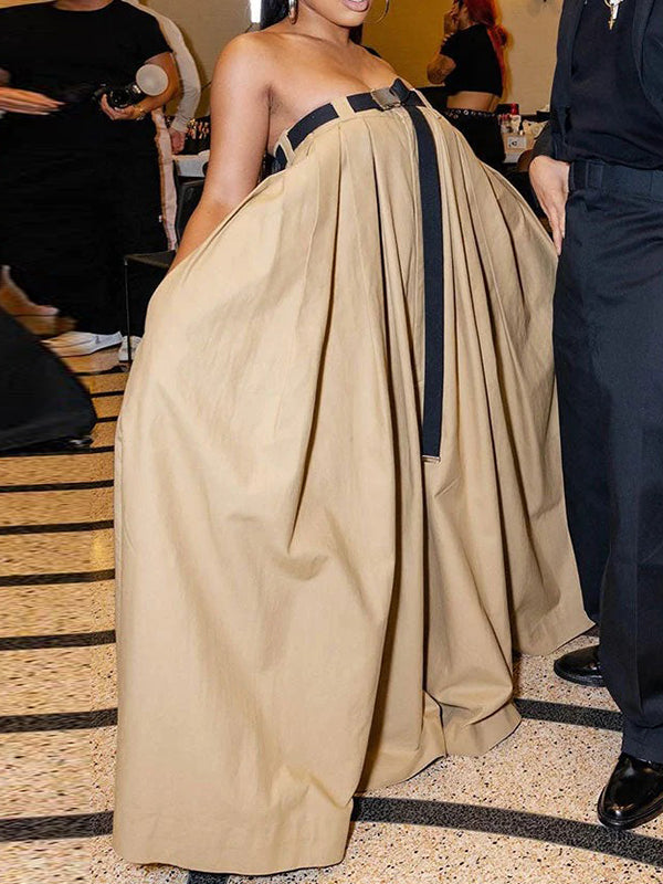 Loose Sleeveless Belted Pleated Pockets Solid Color Tube Jumpsuits