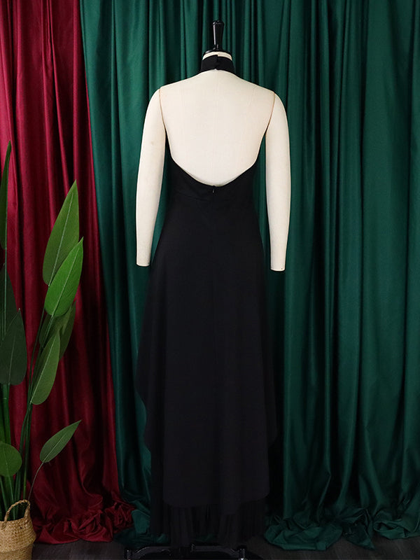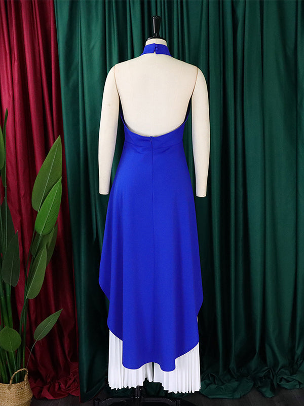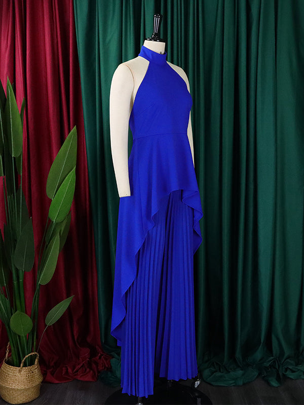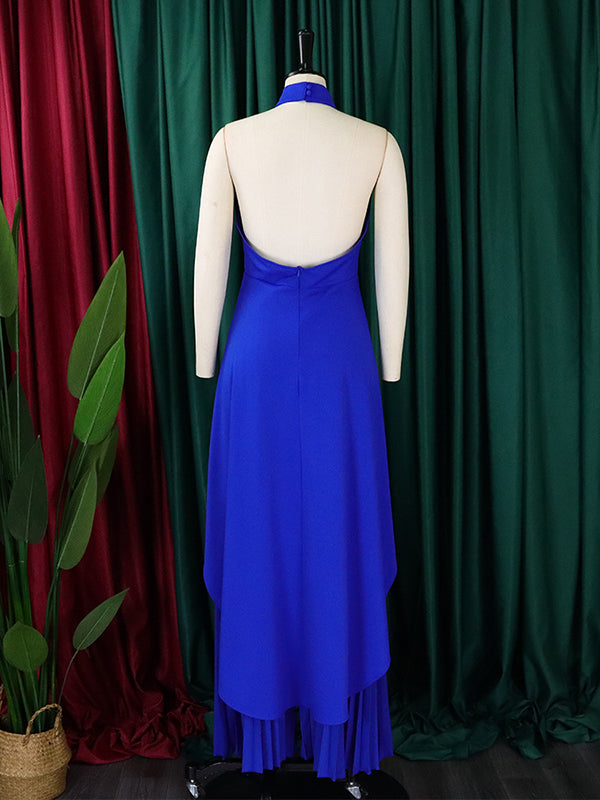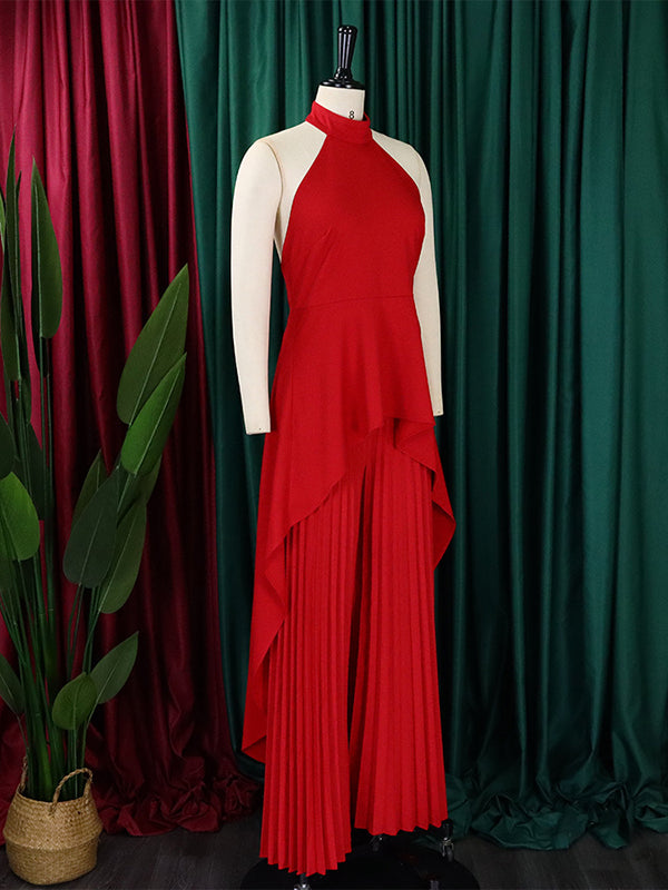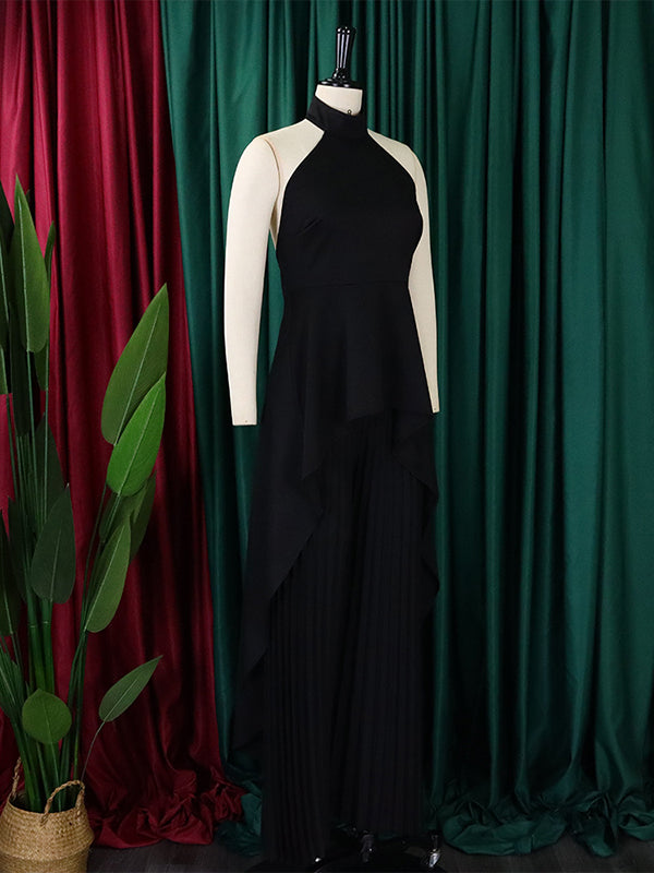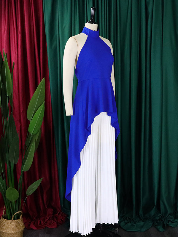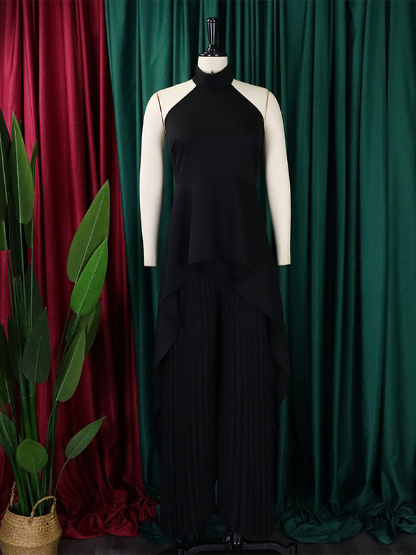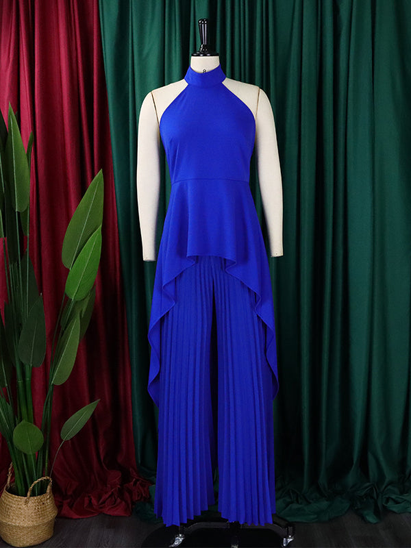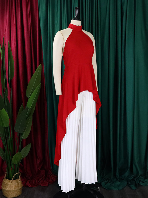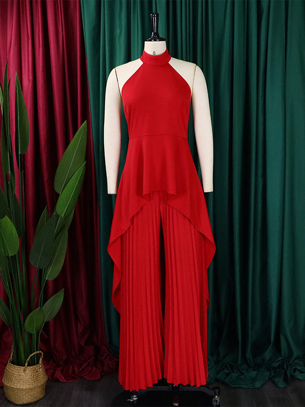Loose Backless Lacy Solid Color Halter-Neck Vest Top + High-Low Pants Bottom Two Pieces Set