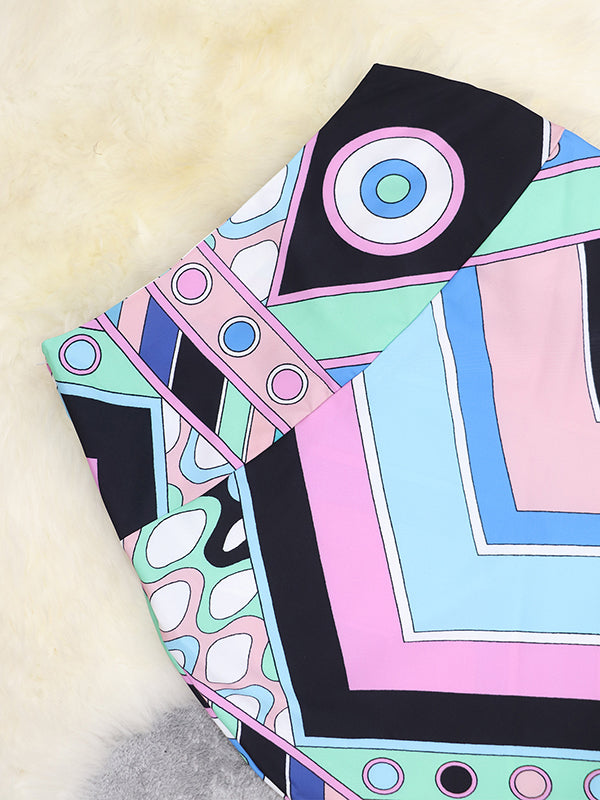 Long Sleeves Buttoned Contrast Color Printed Lapel Blouses&Shirts Tops + Pleated Bodycon Skirts Bottom Two Pieces Set
