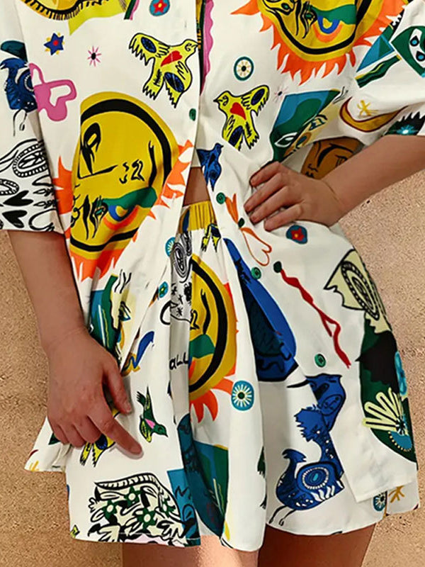 Loose Short Sleeves Pleated Figure Printed Lapel Blouse + Elasticity Waist Shorts Two Pieces Set